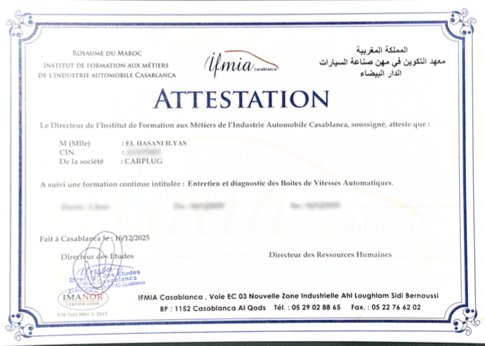 Nous avons le plaisir de vous informer que notre équipe a bénéficié d’une formation professionnelle certifiée délivrée par l’Institut de Formation aux Métiers de l’Industrie Automobile de Casablanca (IFMIA Casablanca).